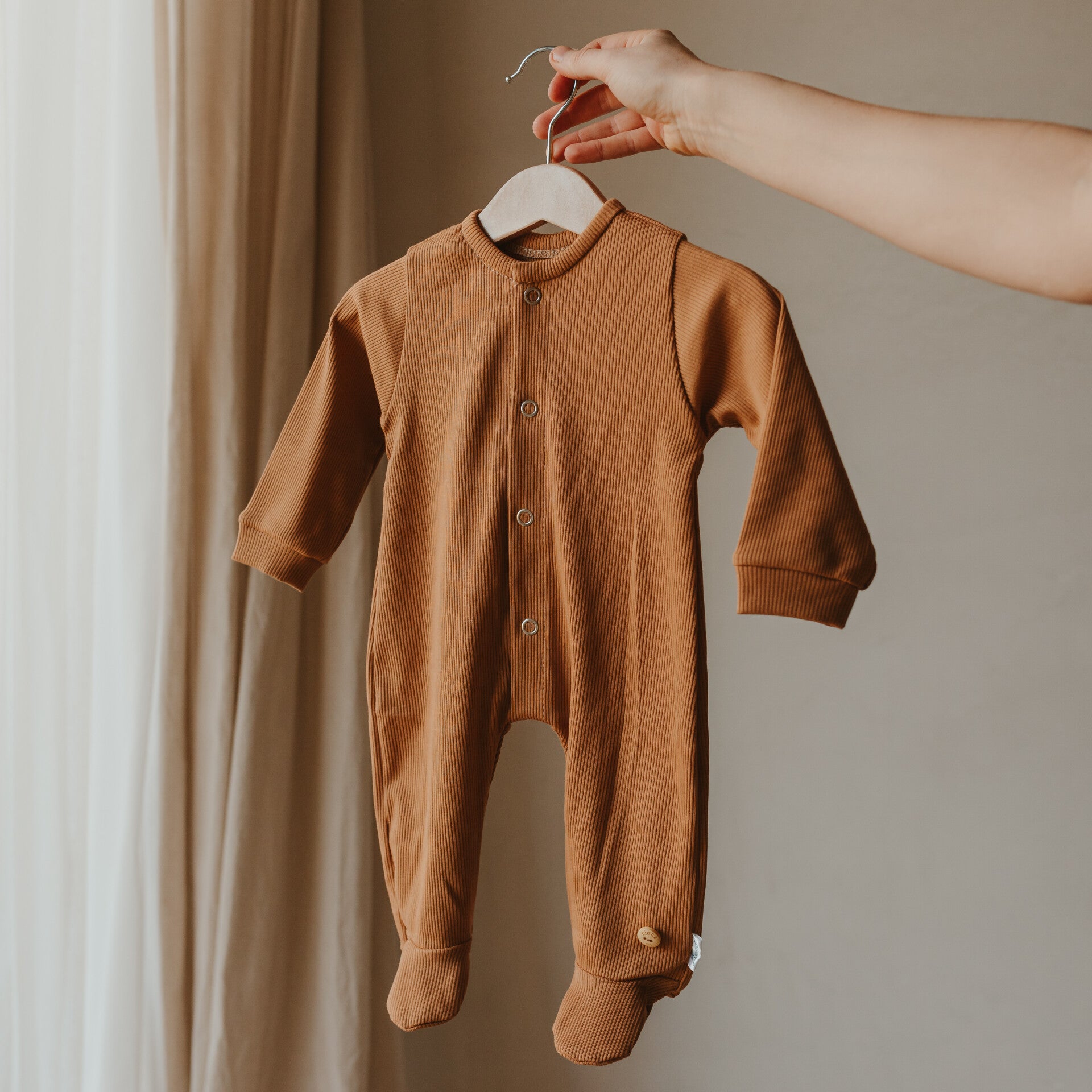 Een kruippakje in camel ribjerseystof met voetjes.