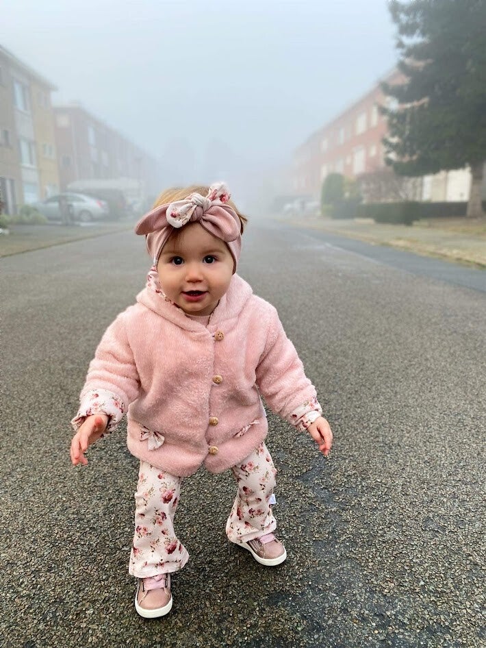 Annelou draagt een versie in het roos met aan de binnenzijde de roosjesstof.