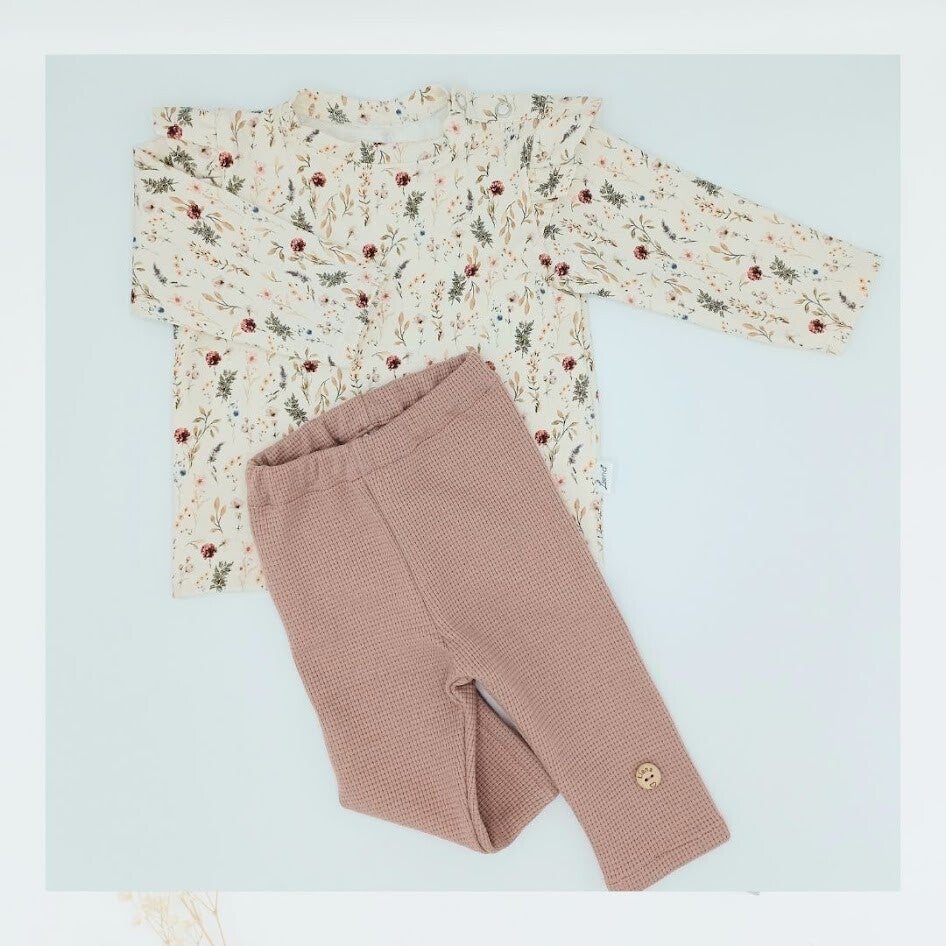 Mooi setje tshirt romantische bloemen en kan gecombineerd worden met drie soorten broekjes. In het olijfgroen, beige en kleiroze.