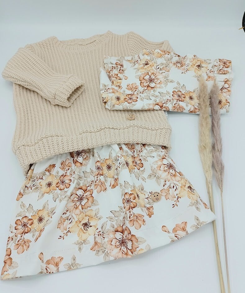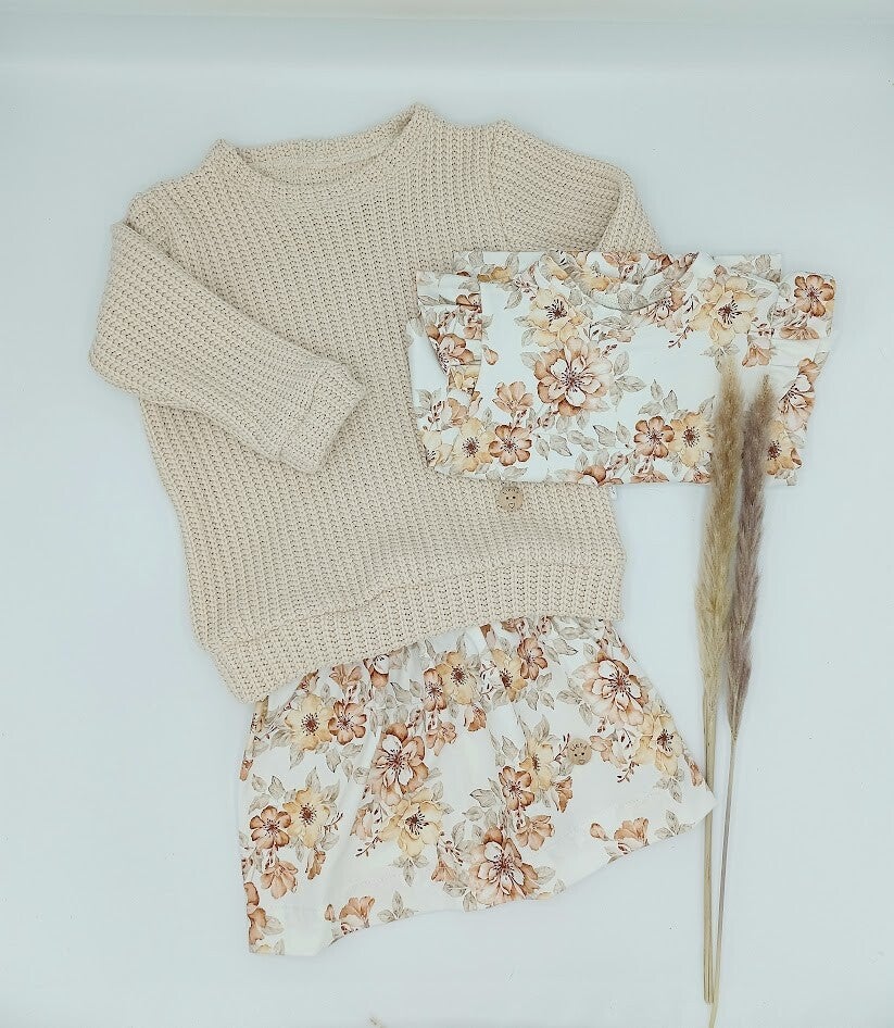 Een zeer mooi setje van rokje flowers cacao en oversized pull in ecru breiwerk. Kan ook zeer mooi gecombineerd worden met de tshirt flowers cacao.