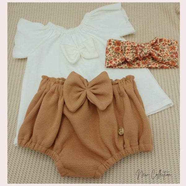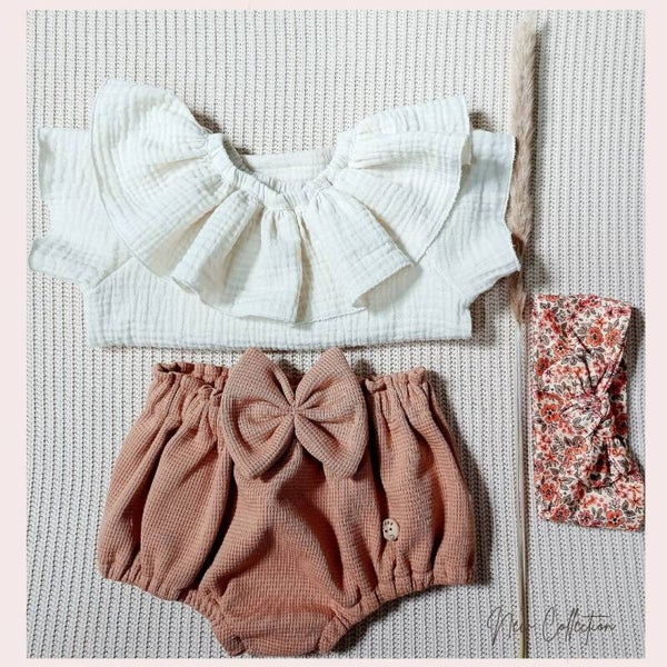 Een zeer mooie bloomer in perzikkleur wafeljersey en afgewerkt met een strik. Gecombineerd met offwhite tshirt met raglanmouwen en een mooie haarband in bloemenstof.