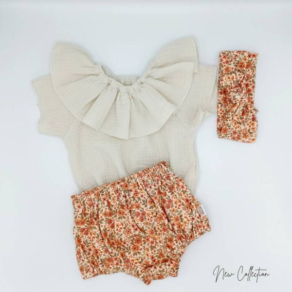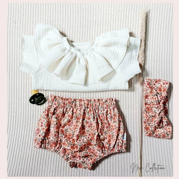 Een zeer mooie bloomer in bloemenstof. Gecombineerd met offwhite tshirt met raglanmouwen en afgewerkt met haarband.