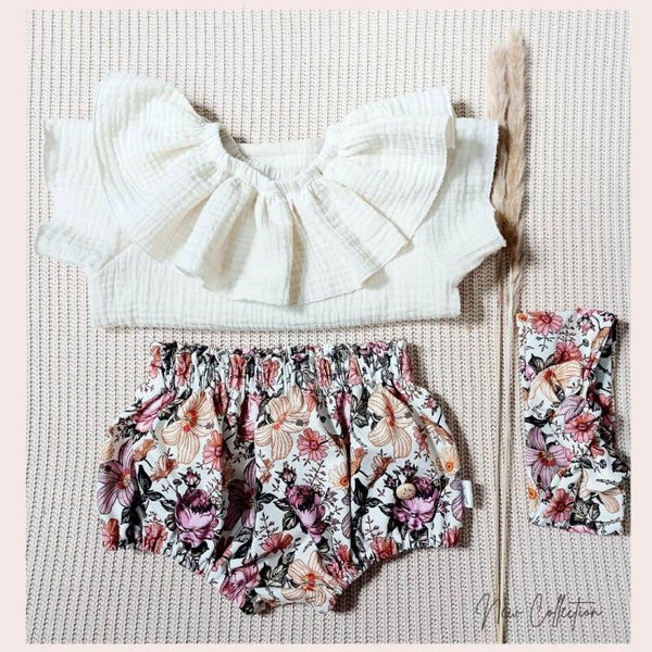 Een zeer mooie bloomer in bloemenstof paars. Gecombineerd met offwhite tshirt met raglanmouwen. Afgewerkt met haarband offwhite of haarband paarse bloemen.