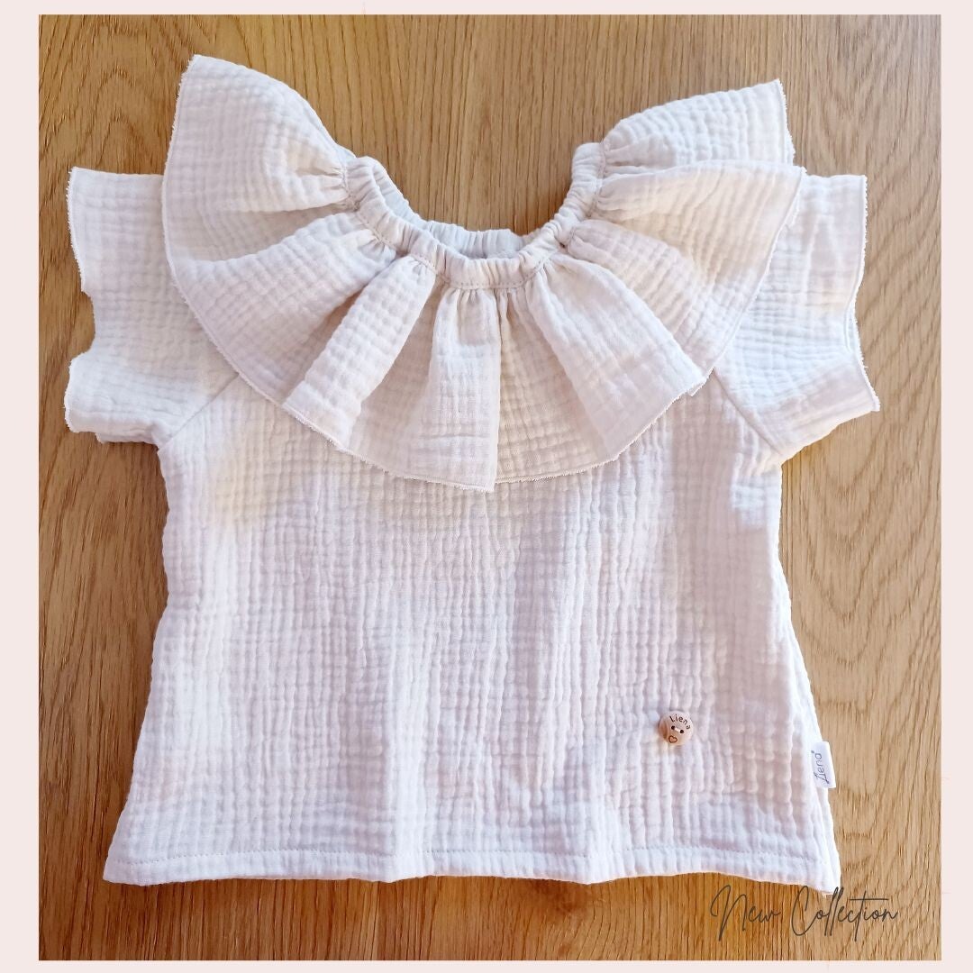 Een zeer mooi bloesje met rucheskraag in offwhite mousseline stof. Is zeer tof voor onze kleine prinsesjes. Er is een elastiek voorzien aan de kraag en kan vlot over het hoofdje worden gedaan. Het bloesje is zijdelings wat uitlopend en tailleert zeer mooi op een legging, broekje of bloomer.