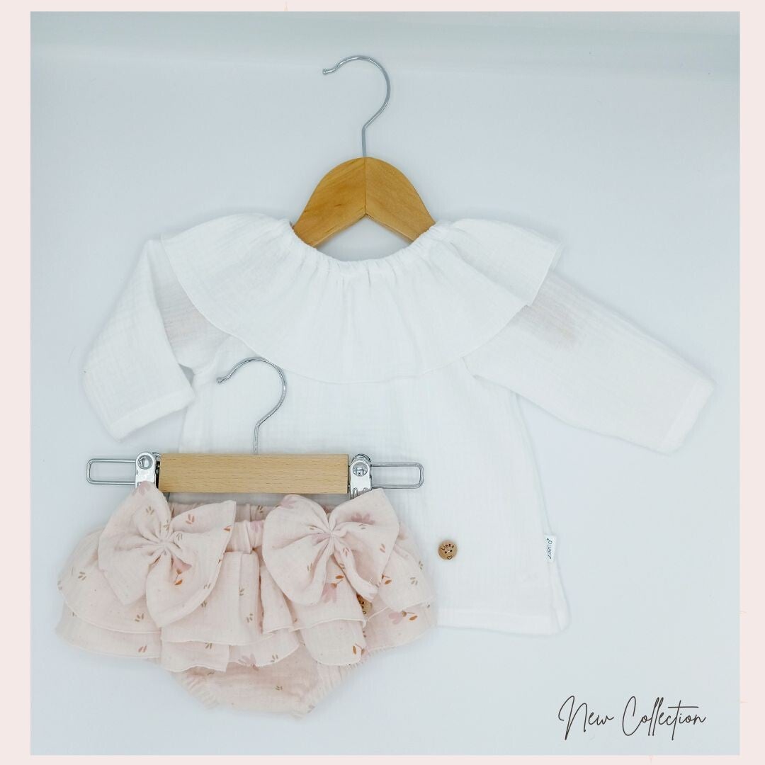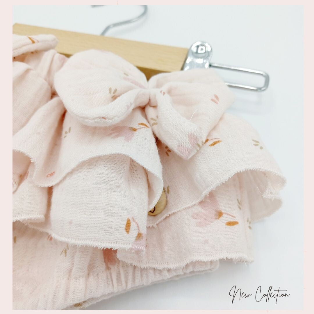 Een bloomer in een prachtige hydrofiel stof, een broekje opgebouwd met twee lagen en twee grotere strikken.