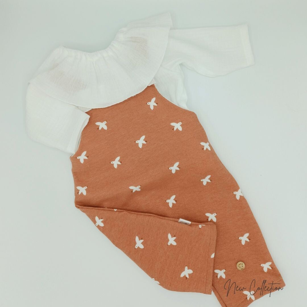 Hier uitgewerkt voor de meisjes met extra franjes in witte mousselinestof. De witte mousselinestof herhaalt zich aan de binnenkant van de tuinbroek.