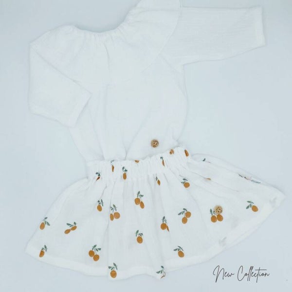Dit is een zeer mooie mousselinestofje met mandarijntjes. Gecombineerd met een tshirt in het wit is dit een topoutfit.