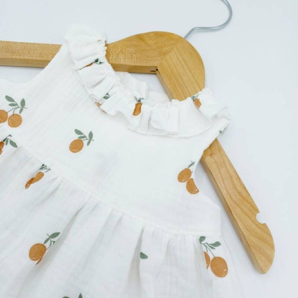 Kleedje in mousseline mandarijnenstof. Er is een kleine ruffleskraag voorzien en achteraan sluit het kleedje met drukknopen.
