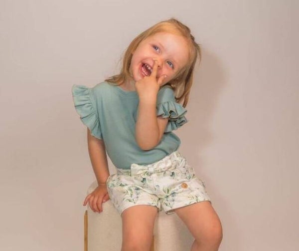 De mouwen zijn ruffles en de stof heeft een lichte stretch.