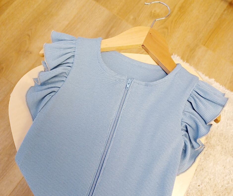 Nieuw model jumpsuit met vooraan een rits en vlindermouwen.