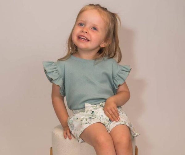 Dit lieve meisje draagt een setje broekrokje/short eucalyptus.