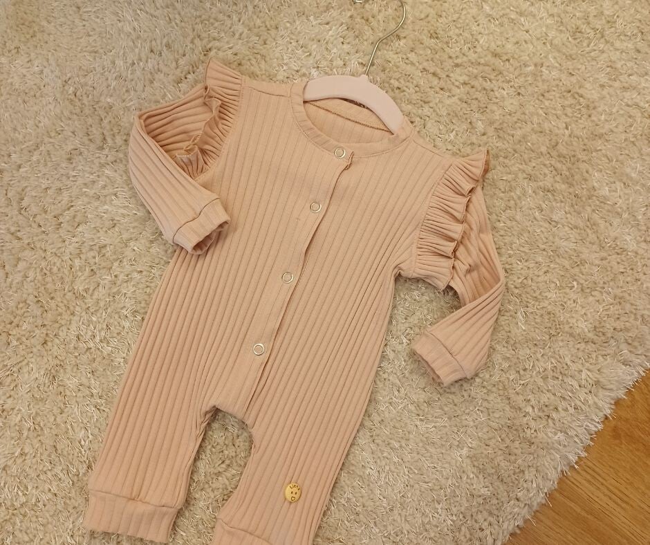 Een nieuw model kruippakje in brede ribstof nude. Met ruffles aan de schouders, kan ook zonder.