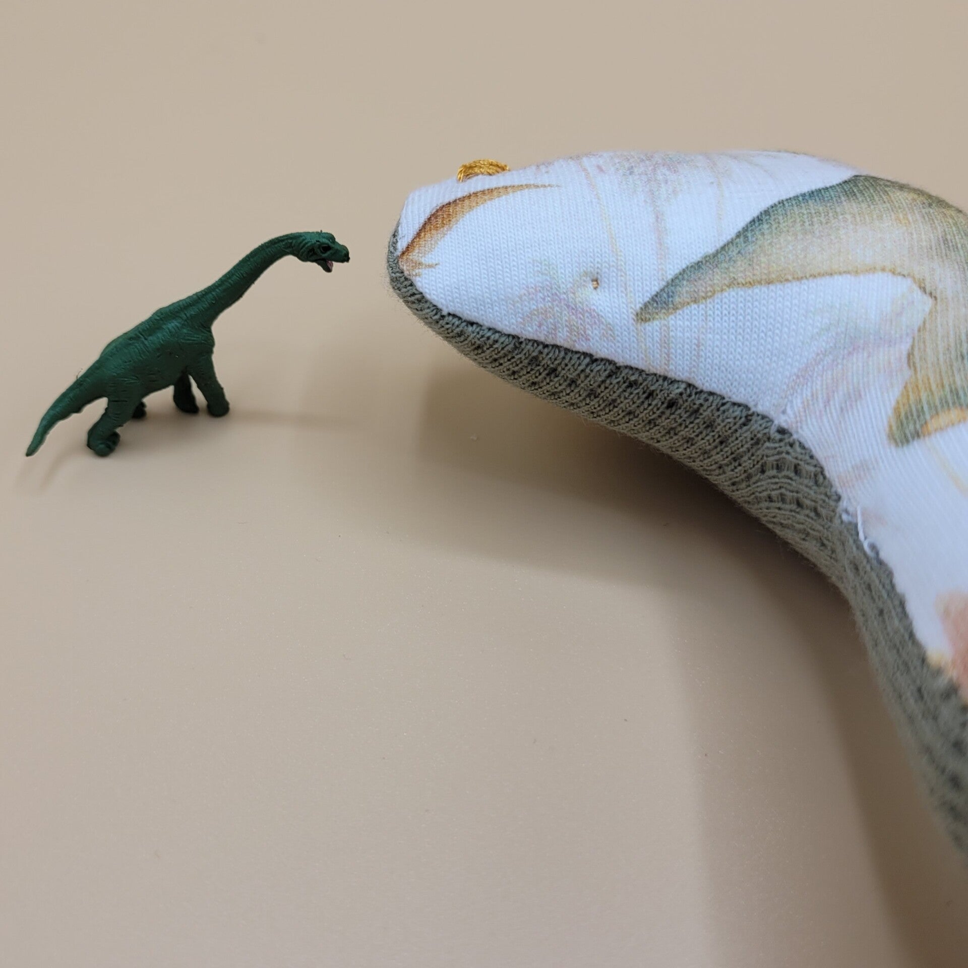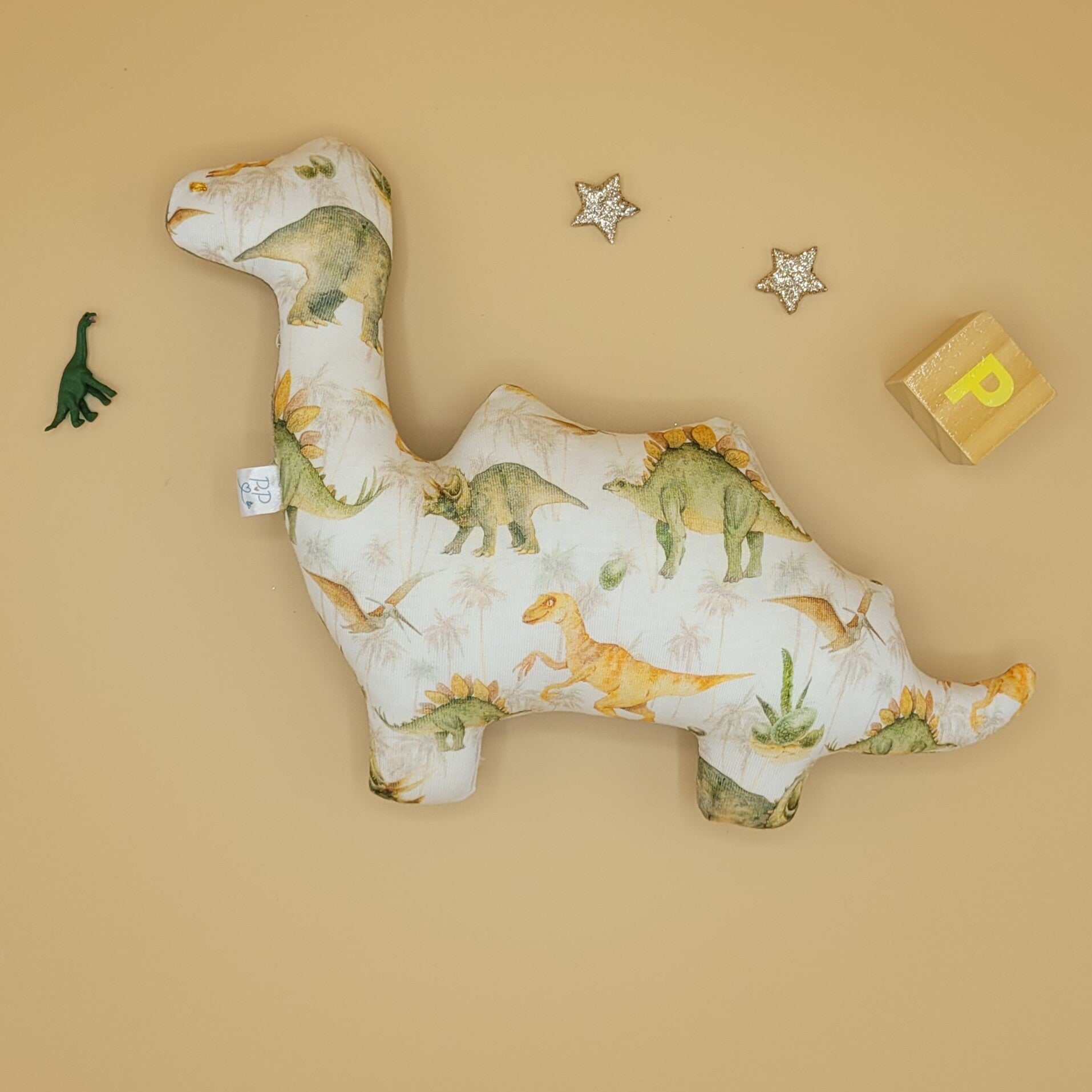 Dinosaurusknuffel in wafeljersey en een printstof. Een maatje voor de stoere jongens.